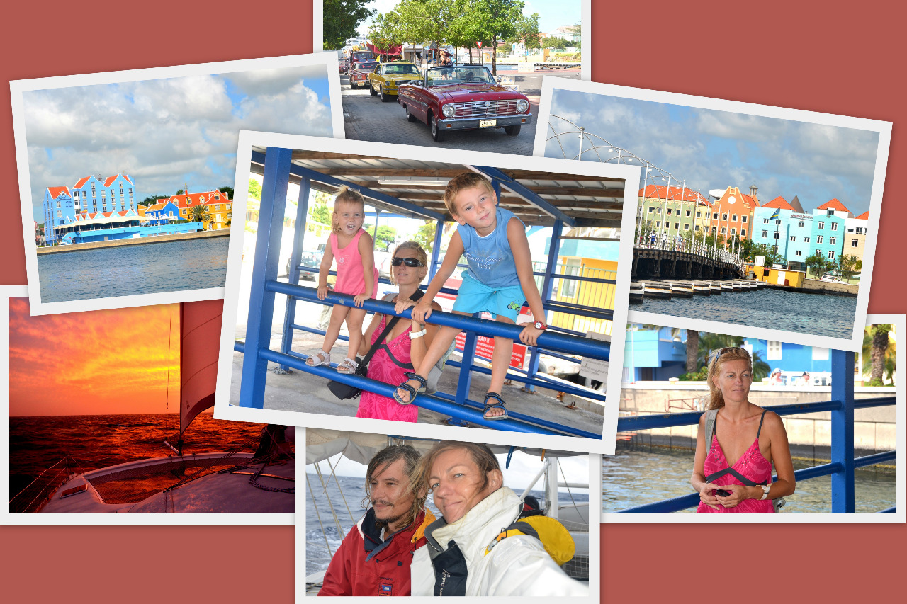 La navigation jusqu’à Curaçao est sportive. La météo a annoncé un vent de 25 nœuds, mais sous les grains, nous avons plutôt 35. Au départ, alors que nous venons tout juste de monter la grand-voile, nous faisons deux empannages involontaires. JF manque de peu de se faire assommer par la bôme… Comme nous sommes vent arrière, nous décidons de nous positionner à 120 degrés du vent pour une meilleure sécurité. A cause de cela, nous ne pouvons pas faire une route directe et devons tirer plusieurs bords. Nous avons des creux qui oscillent entre trois et quatre mètres. Comme les vagues sont irrégulières, nous nous faisons pas mal chahuter. Les enfants, ballotés dans cette mer capricieuse, finissent heureusement par s’endormir. Céramaje file à 12 nœuds et fait même des pointes à 18. Mais dans cette mer croisée, nous ne sommes pas des plus sereins. Sous les grains, nous n’avons aucune visibilité. Notre AIS nous signale la présence d’un pétrolier à côté duquel nous passons sans même le voir ! Après trois heures de navigation dans ces conditions, la mer, près de Curaçao, se calme et devient plus régulière. Nous arrivons à Curaçao après 4 heures 30 de navigation.